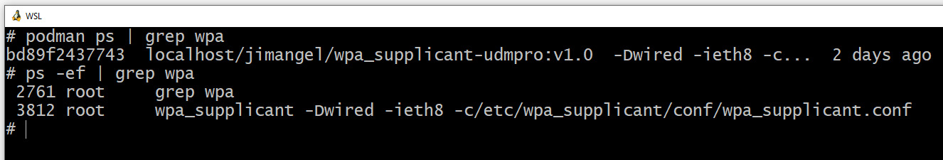If you look at “real” running processes on the UDM Pro you see the wpa_supplicant because we launched it in a container.
